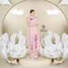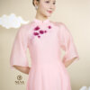 – Họa tiết: những cánh hoa bướm được lựa chọn làm ý tưởng thiết kế với ý nghĩa về sự may mắn, thịnh vượng. Những cánh hoa mỏng manh mang lại vẻ đẹp cuốn hút khó cưỡng. Những bông hoa bướm được thiết kế in ở tà áo với phần trang trí thủ công tạo nổi ở tà áo ấn tượng. Ngực áo cũng được nhấn nhá bằng cụm hoa nhỏ. Trên nền màu hồng pastel, những bông hoa bướm tím hiện lên nổi bật và đẹp mắt.