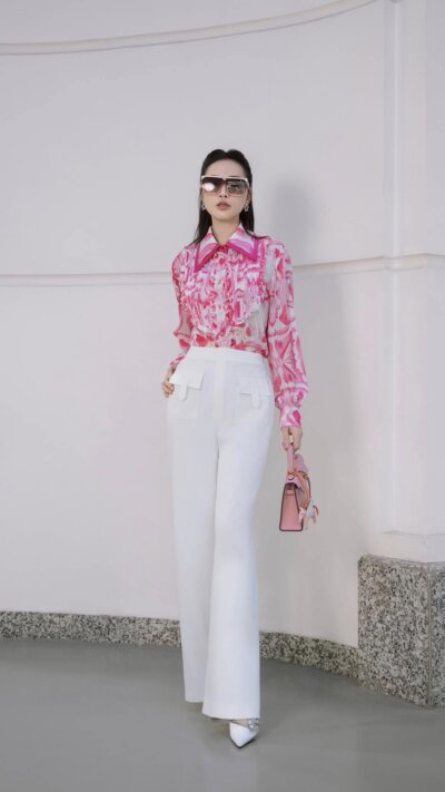 _Kiểu dáng: áo sơ mi dáng xuông dài tay, cổ đức bản to có in viền hồng lạ mắt, có nẹp mở cài cúc thân trước. Lá cổ to bản có xếp bèo…