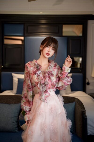 Áo sơ mi dáng xuông dài tay, cổ tim sâu có bèo đính hoa điệu đà Misty Sonata 25S1W142005H021